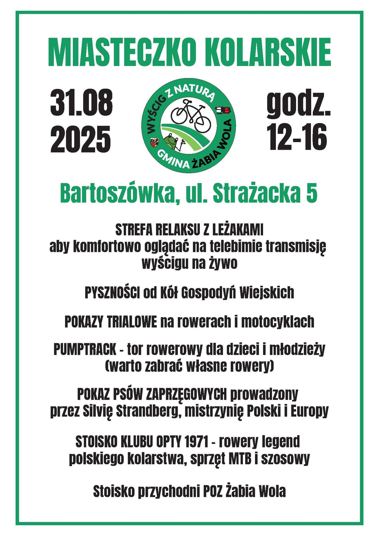 Kolarskie Miasteczko z Biurem Zawodów oraz startem i metą wyścigów znajdzie się w Bartoszówce (ul. Strażacka 5) w Gminie Żabia Wola. Organizatorzy przygotowali mnóstwo atrakcji.