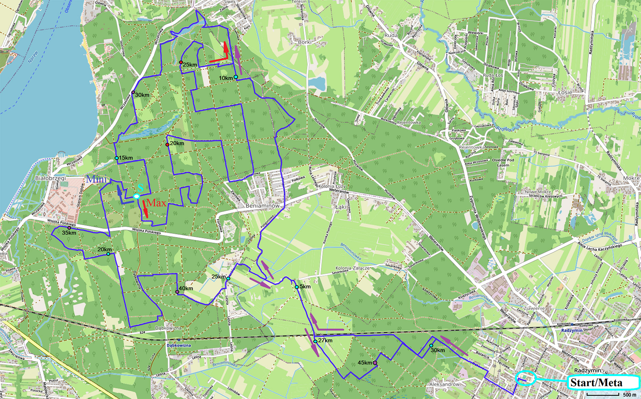 Po ponownym dotarciu do rozjazdu (33km), sędzia skieruje kolarzy w ślad za Mini aż do opłotków Białobrzegów. Trochę ponad kilometr dalej, po przecięciu asfaltu ul. Wojska Polskiego, stosunkowo krótki, ale morderczy podjazd, gdzie „młynek” będzie raczej koniecznością – tu będzie można pokazać swoją prawdziwą wartość mtb. Potem jeszcze bunkry w Białobrzegach, nawrotka na „betonce” w Dąbkowiźnie, kaskada i ostry zjazd na Beniaminowskie Łąki. Po dotarciu do ul. Leśnej, pozostanie do mety około 7 kilometrów. Pierwsze 3km gruntową drogą przez łęgi, a po przejeździe przez tory na powrocie (28/44km Max) szybka, ale urokliwa końcówka. Finiszowe 4 kilometry to na przemian leśne dukty, ścieżki po pagórkach i szersze drogi dające szanse na wyprzedzanie, a ostatnie 1000m małe uliczki w opłotkach Radzymina kierujące wprost na metę.